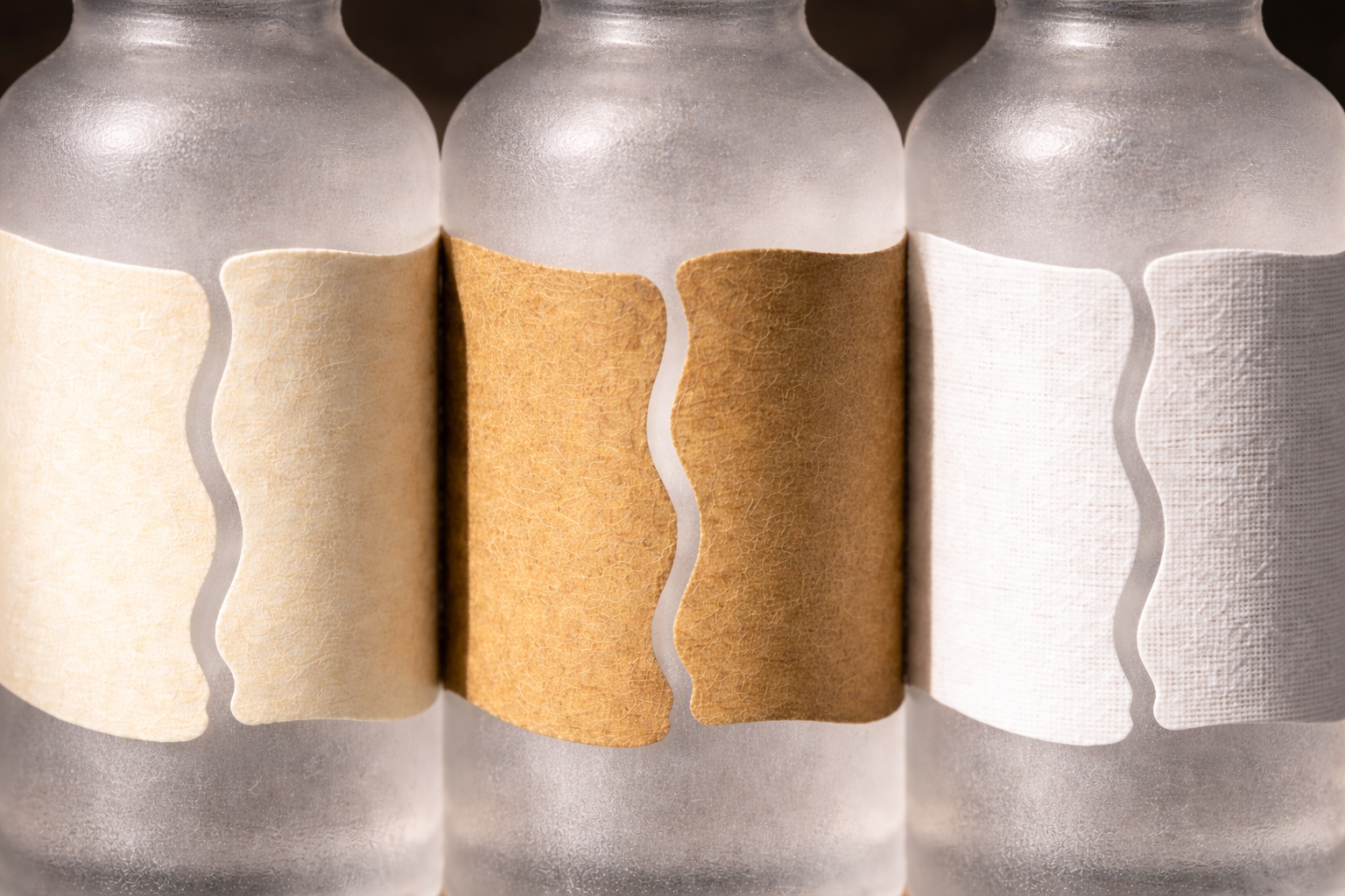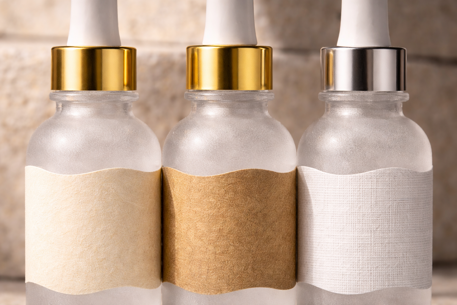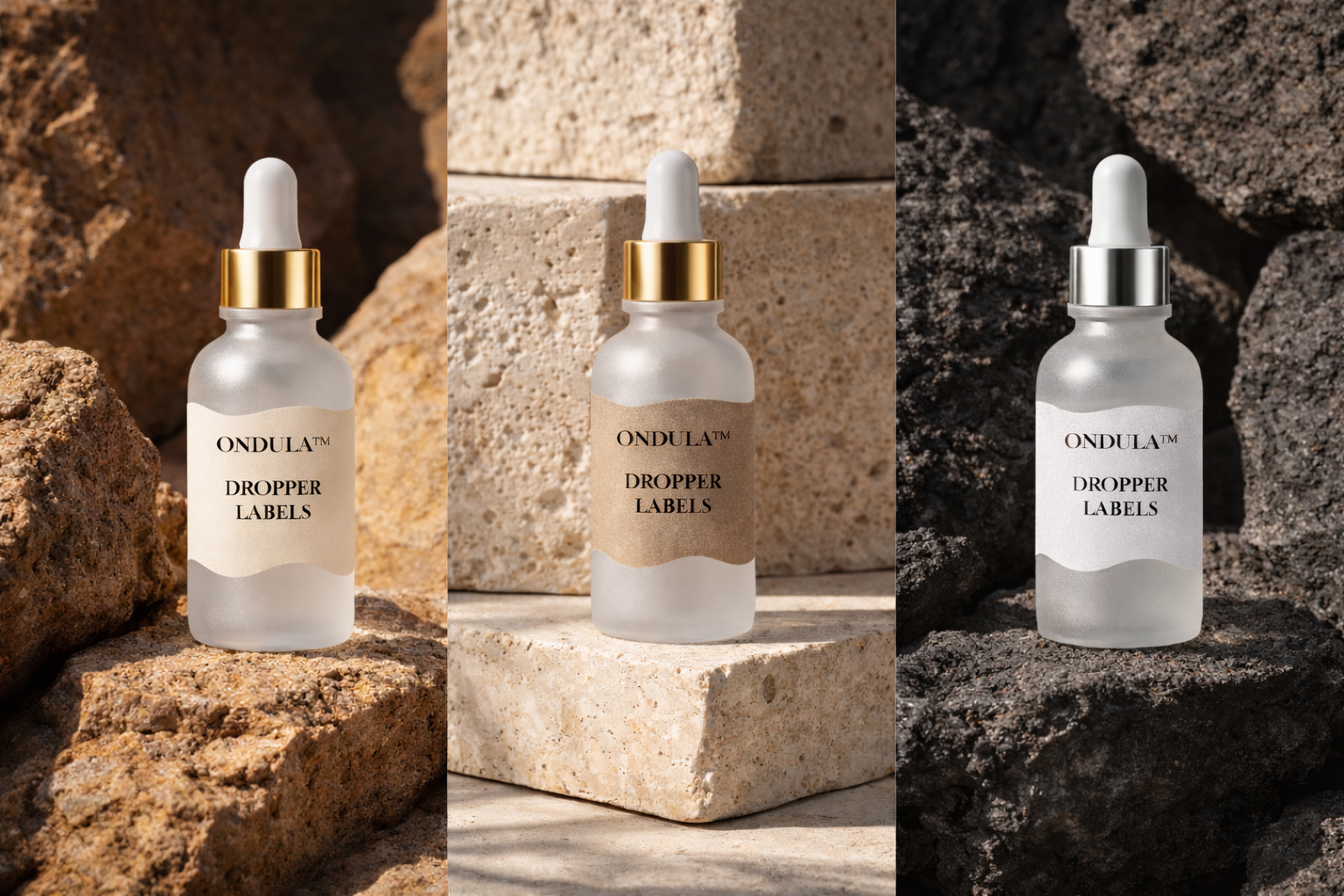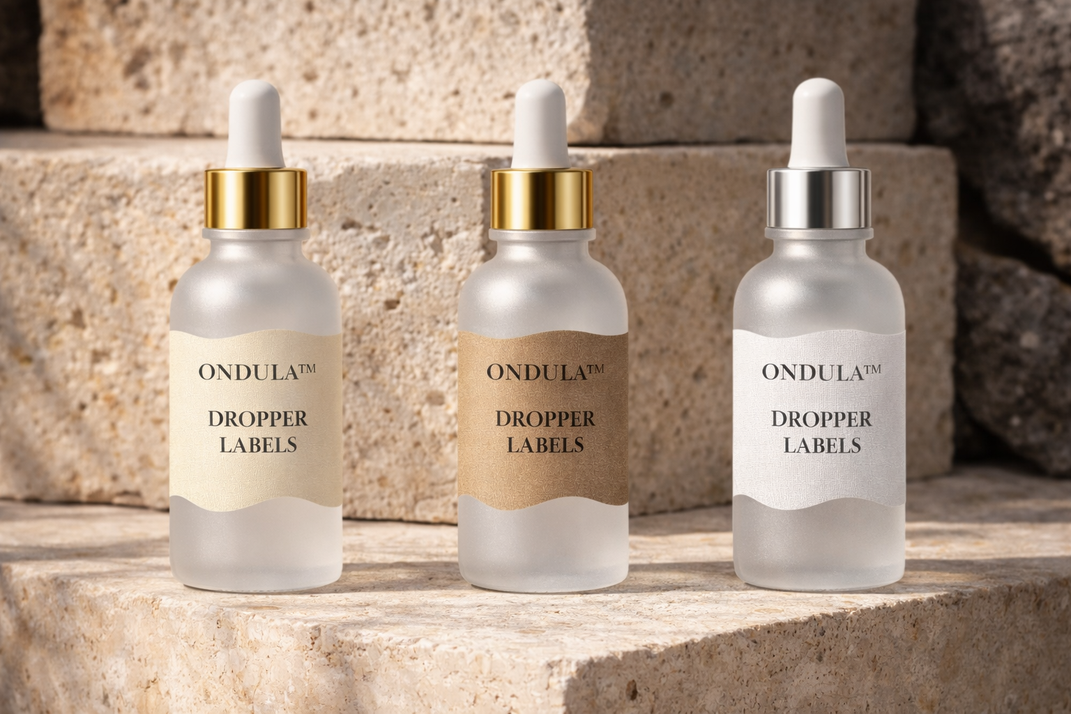 Sculptural elegance to cosmetic packaging. Featuring a distinctive wavy silhouette and refined paper textures, these labels transform luxury dropper bottles into a sophisticated presentation suitable for skincare, oils, serums, and fragrance products.